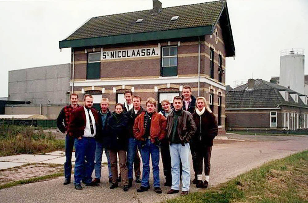 Het bestuur van de KPJ Sint Nyk in 1993 voor het voormalige tramstation in Sint Nyk, het onderkomen van de jongerenverenigingen
