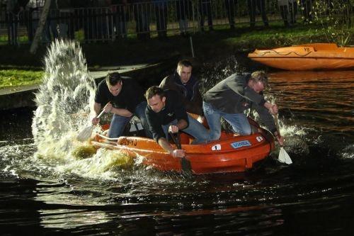 Via een oversteek in een binnenband moest de overkant worden gehaald. Vooral het instappen vergde teamwerk om niet te water te vallen . Daarna moest men in een bootje en met de meegebracht peddels proberen om met een aan de boot geknoopt touw een gewicht zo hoog mogelijk te krijgen. Er waren bootjes bij die een hekgolf veroorzaakte als een zeeschip zoveel kracht en verbetenheid werd in deze opdracht gelegd . Om weer aan de overkant te komen was er een stellage en hangend en slingerend aan ringen gleed men een aantal meters boven het water. Voor vele deelnemers een aantal angstige seconden en op een enkeling na werd dit droog gehaald. Via een route door het dorp kwam men bij het oude Groene kruis gebouw waar voor de snert werd genuttigd nog geblinddoekt een kleine hindernis moest nemen. Bij deze hindernissen veel publiek en de ploegen werden dan ook luid aangemoedigd.