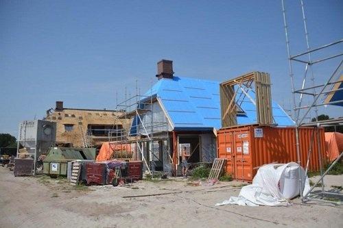 De elf nieuwe watervilla's in recreatiepark Idskenhuizen worden voorzien van een rieten dak. De rietdekkers zijn in zomerse omstandigheden bezig met de werkzaamheden.