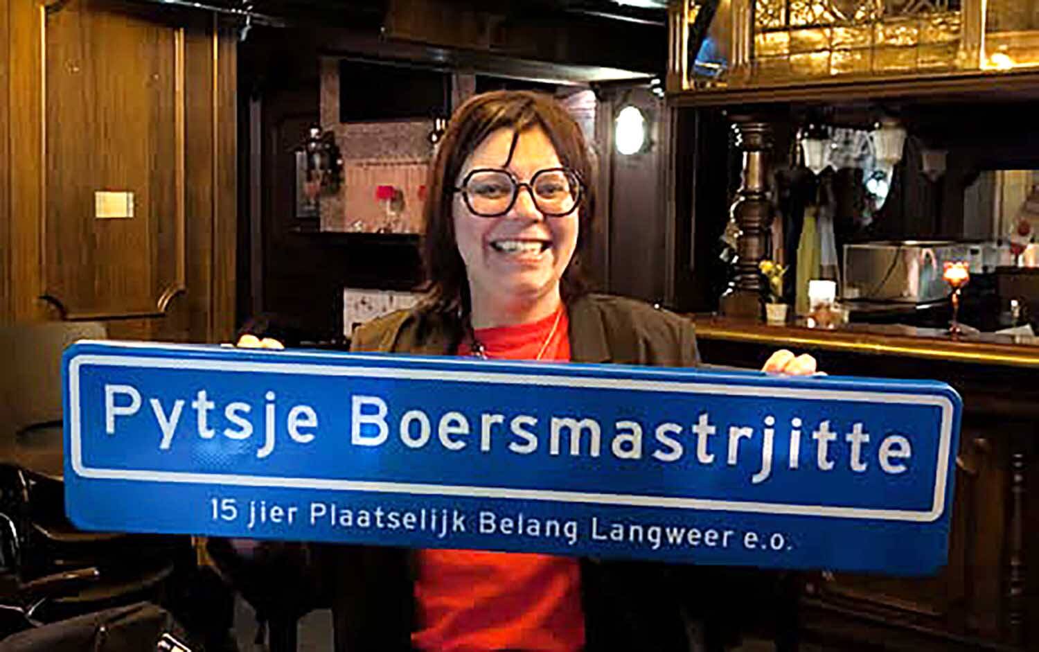 Voorzitter Pytsje Boersma van Plaatselijk Belang Langweer is op bijzondere wijze gehuldigd tijdens de algemene ledenvergadering. Zij kreeg een straatnaambord met de tekst Pytsje Boersmastrjitte als blijk van waardering voor haar inzet.