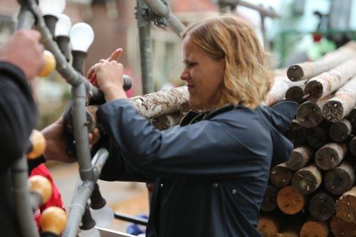 De feestverlichting ligt in een logische volgorde op de wagen waarop de palen in elkaar worden geschroefd. Voorzitter Edith Galama zorgt samen met Age Feenstra dat de vlaggen op de palen komen waarna Tineke Visser handig alles met een grote rol tape de zaak omwikkelt. De tape is maar amper afgesneden of Martin van der Goot en Mick van der Kuyl gooien een enorme zwaai de palen op de schouder om ze vervolgens in de vooraf gegraven gaten zetten. Christiaan Hoekstra stampt de paal stevig vast in het zand en gaat er nog even met de bezem omheen voor de afwerking