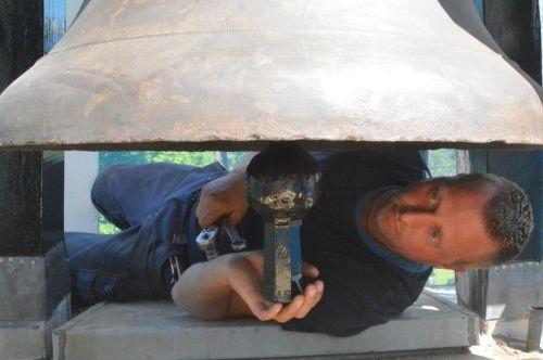 SINT NICOLAASGA -De luidklok is donderdag na een restauratie weer in houten torenspits van de PKN-kerk in Sint Nicolaasga geplaatst. Met behulp van een grote kraan is de klok in zijn nieuwe ophangconstructie geplaatst.