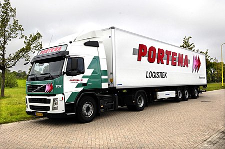 Het vrachtwagenpark van Portena Logistiek BV in Heerenveen met zijn herkenbare logo. Op de foto uit 2010 staat truck 262 met de oplegger waarop de eigen naam staat. Het bedrijf maakte op de opleggers ook reclame voor zijn eigen klanten.