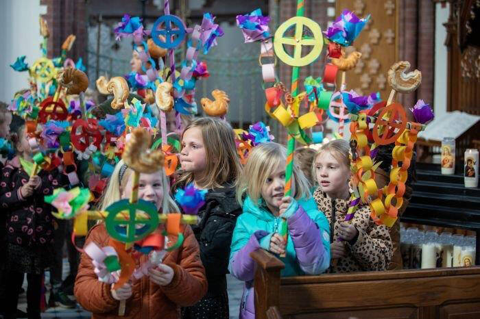 SINT NICOLAASGA - Met ruim tweehonderd kinderen in optocht is zondag in Sint Nicolaasga Palmpasen gevierd. In de Heilige Nicolaaskerk werden de kinderen met hun palmstok opgewacht door de ouders. Daarna werd in een gezinsviering het verhaal van Palmpasen.