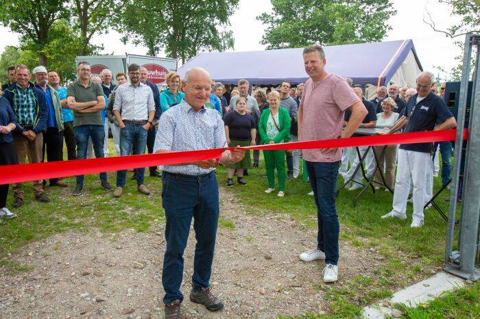 Met het doorknippen van een lint door Willem Steneker is het zwemmersplek van Doniaga De Headammen officieel geopend. (Foto)
