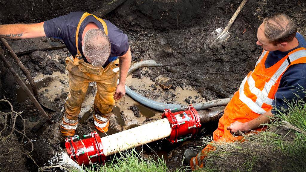 Monteurs zetten een nieuw stuk buis op de plek van de breuk in de waterleiding met klemmen vast.