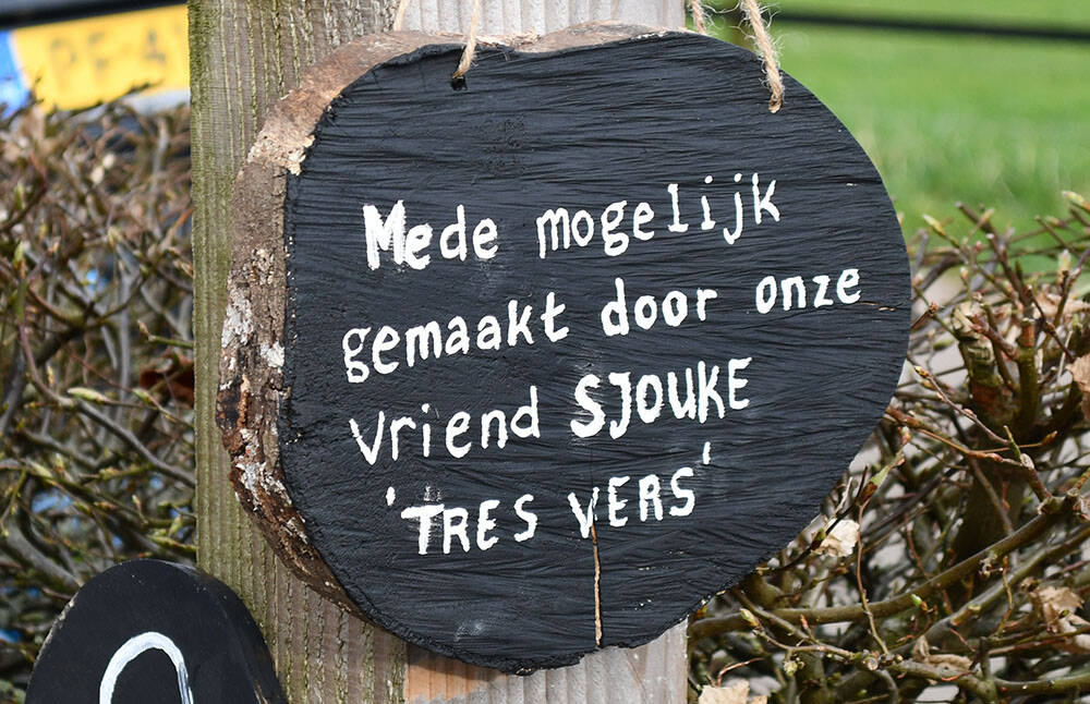 Aan het einde van de middag, toen alle klussen gedaan waren, heeft Sjouke Bouma van TresVers zijn naambordje opgehangen als bedankje voor het nieuwe schaduwdoek, dat hij had geschonken. Bewoners en medewerkers kunnen voortaan ook in de zonnige maanden lekker in de schaduw zitten.