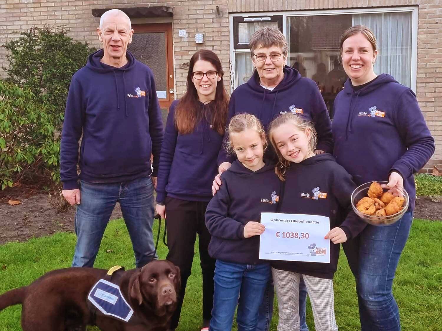 De eerste oliebollenactie in Sint Nyk leverde ruim duizend euro op. Op de foto de bakkers van toen met achter van links naar rechts Peter Meijer, Wietske Meijer, Matty Meijer-Hooghiemstra, Tjitske Hoekstra-Meijer. Voor: Hulphond Whisper, Fenna Hoekstra en Marije Hoekstra