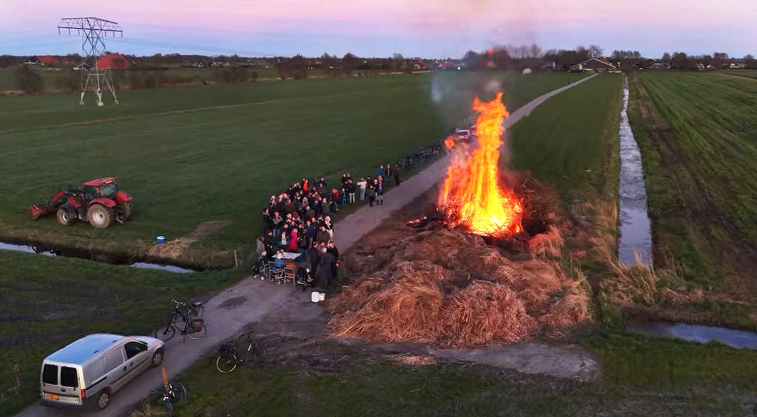 In de weken voorafgaand aan Pasen reden inwoners af en aan met snoeihout en ander brandbaar materiaal. Op het erf van de familie Veldstra ontstaat zo laag voor laag een imposante bult. ,,Iedereen levert z’n bijdrage en samen maak je er iets groots van'', aldus een aanwezige. Zodra het vuur wordt ontstoken, verzamelen de dorpen zich rond het knetterende middelpunt, waar het hout knispert en de vlammen hoog boven het land uitslaan.