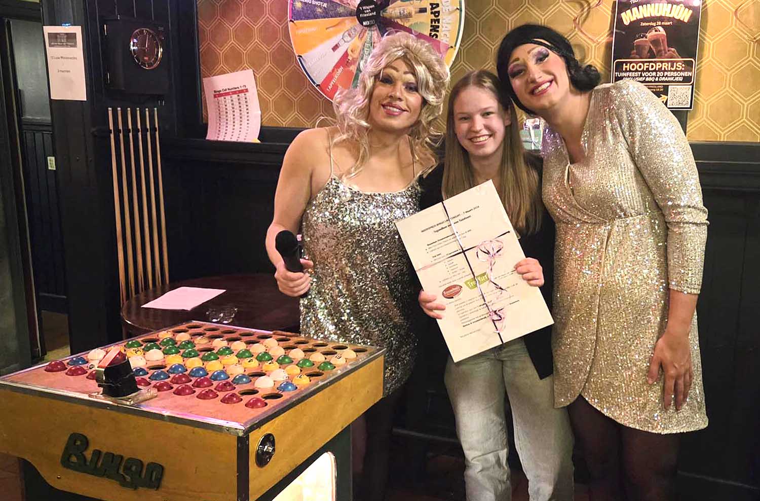 De hoofdprijs van de Ladiesnight Bingo in Café het Wapen van Friesland is zaterdagavond 7 maart 2026 gewonnen door Iris van der Heide. Zij ging er in de superronde vandoor met een compleet verzorgd tuinfeest voor twintig personen. Dankzij Tres Vers, Bouwhuis Horeca en Grootverbruik en Café het Wapen van Friesland kan zij binnenkort met negentien gasten aanschuiven voor een barbecue met alles erop en eraan.