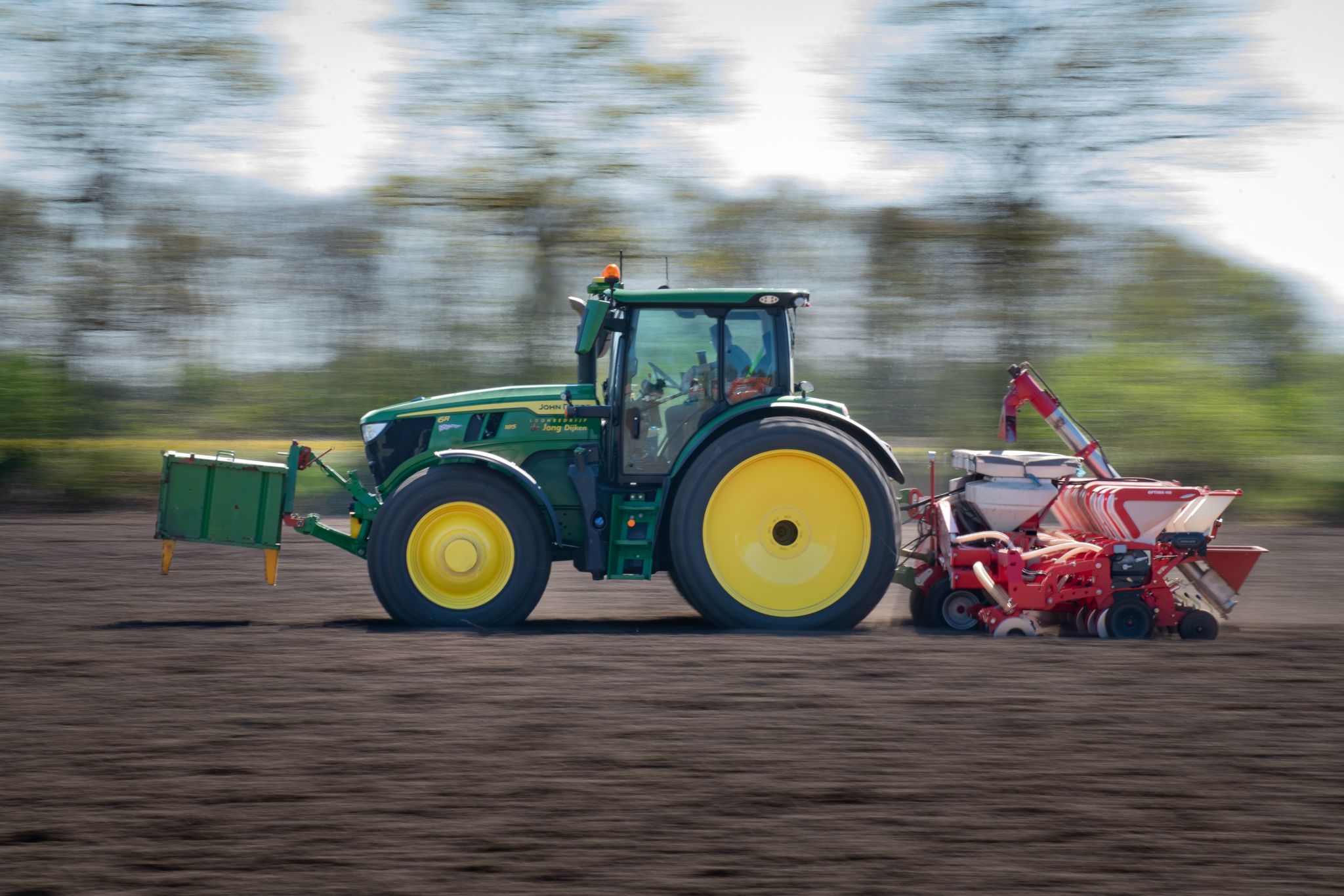 In drie weken tijd zaait loonbedrijf De Jong uit Dijken zo’n driehonderd hectare maïs bij boeren rond Sint Nicolaasga. Op de foto is medewerker André Veld aan het werk op een perceel van melkveehouder Frits Sijbesma aan de Stripedyk in Idskenhuizen. Het gaat om een perceel van twintig hectare dat eerst is geploegd. De bovenlaag met kluiten is daarna met een rotoreg verkruimeld en zaaiklaar gemaakt.